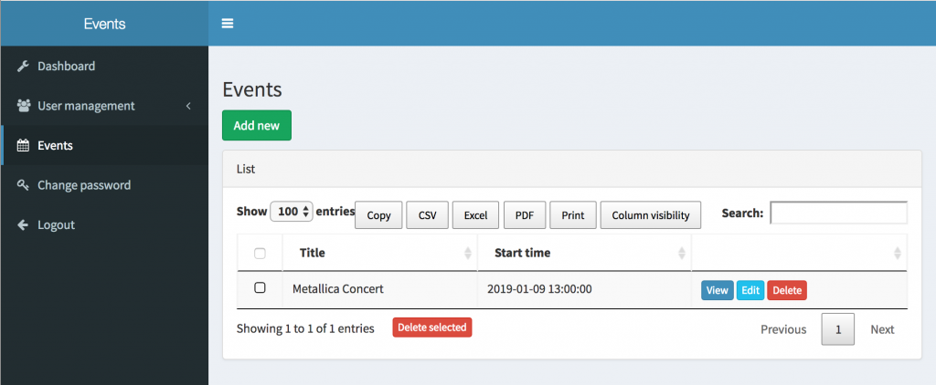 And that's it, all you need to do now is create a list, so in app/Http/Controllers/Admin/EventsController.php we have this: