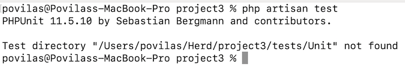 In this case, the code author has deleted that example test with the full folder of tests/Unit. It may be fine, but the problem is that testing is still configured to run tests from the tests/Unit folder, which doesn't exist anymore: