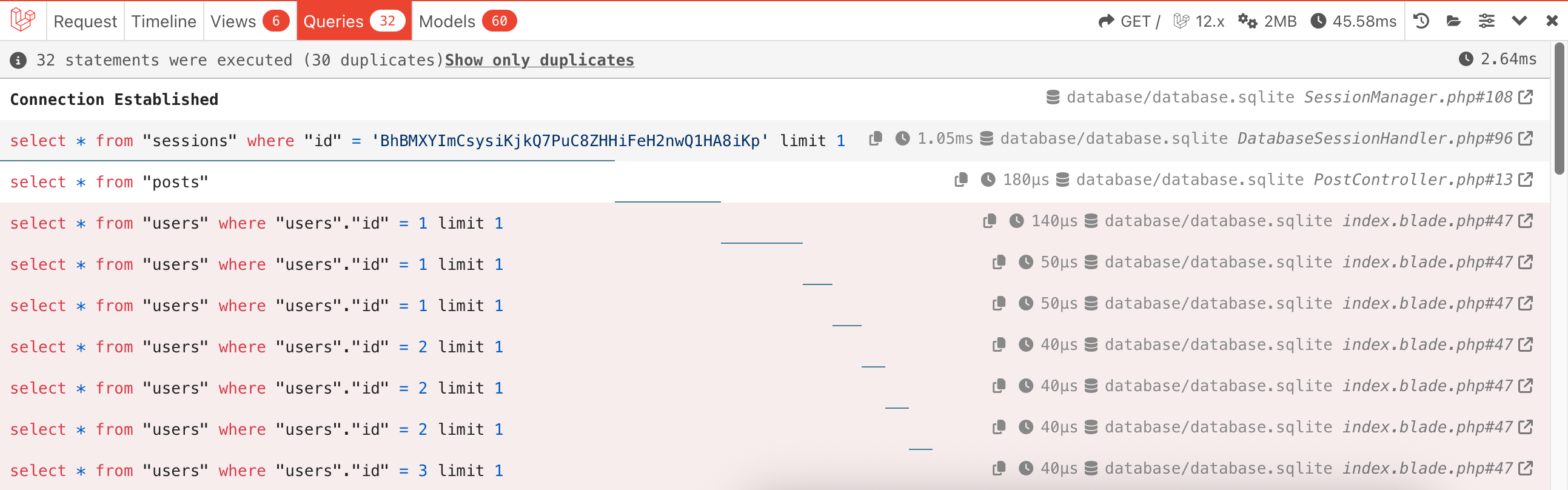 Let's return to our original example of viewing posts with their authors. As we've seen, without eager loading, this produces 31 queries - one for posts and 30 separate queries for users.