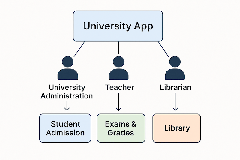 In real life, such a University Management system may be much more complex, with modules like Curriculum, Timetabling, Room Scheduling, LMS, Research Projects, Grants, Billing/Finances, HR, Payroll, Facilities, and Asset Management. But for this course section, I've simplified the scope to only those three modules listed above, to make it easier to understand.