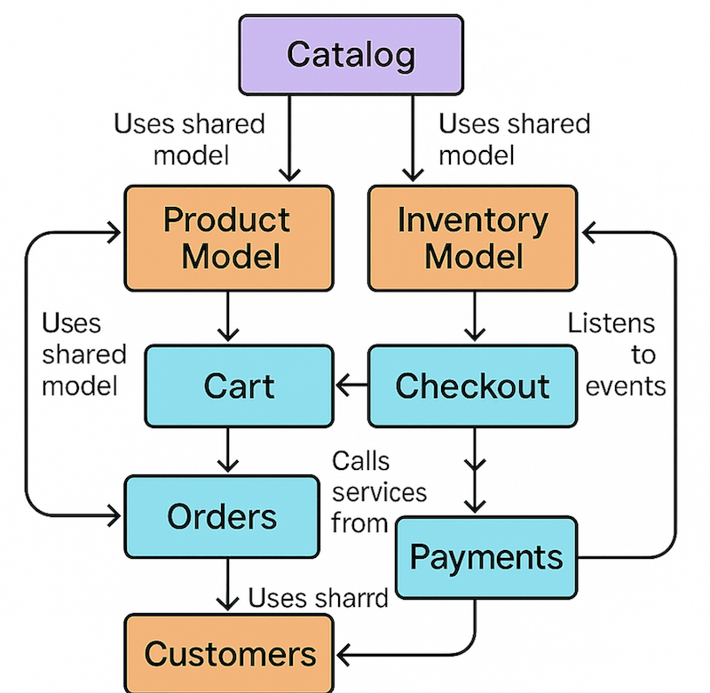 For example, a CMS or e-commerce site where everything interacts through a central Page or Product model. Even if you split it into “Catalog,” “Cart,” “Checkout,” and “Orders” modules, they all depend on the same models, events, and observers. You’ll spend more time figuring out how to share models across modules than developing features.