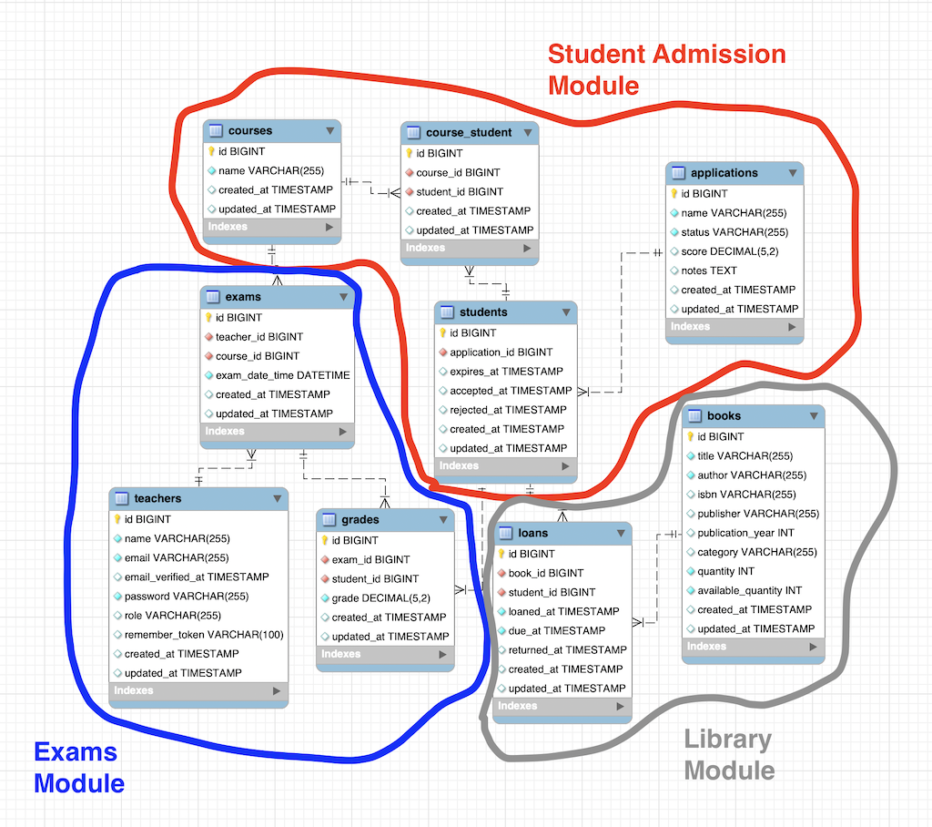 Also, there may be "core" DB tables that would be related to multiple modules, like "users" or "students", in our example. Those are candidates for the so-called "Core/Common/Shared" module, or may even be taken outside of the Module system altogether, into the common app/ folder.