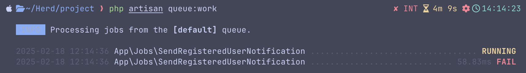 Imagine the scenario: We have the same notification job, which would fire the email to admins. After starting the queue worker, it will be empty at first as there are no jobs in the queue, and it is waiting for the jobs.