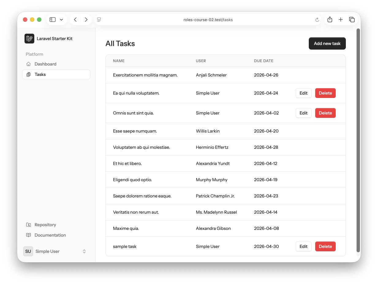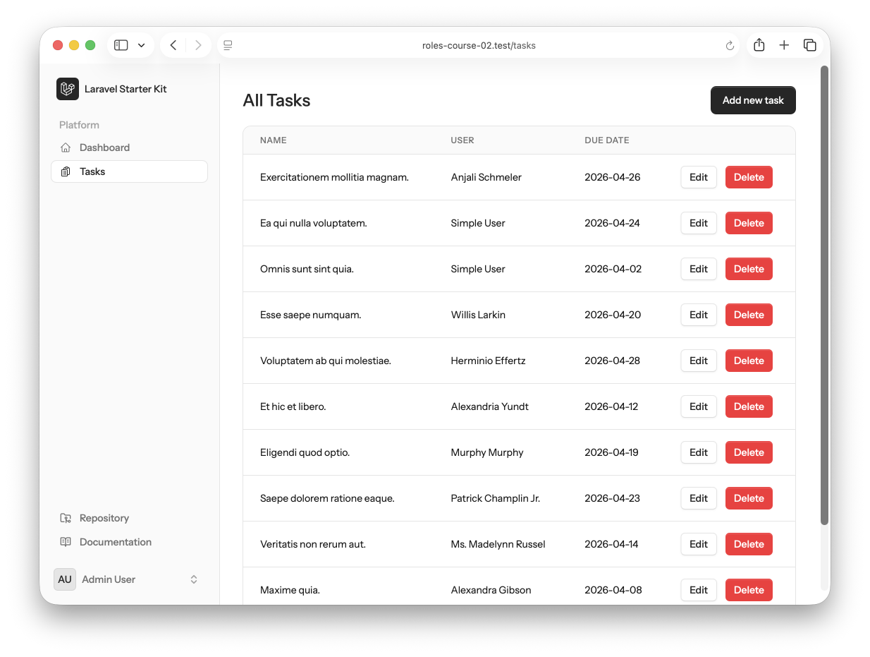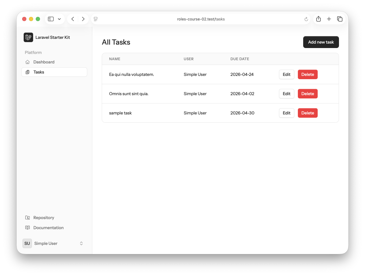 use App\Http\Controllers\TaskController; Route::middleware('auth')->group(function () { // ... starter kit default routes Route::resource('tasks', TaskController::class); });