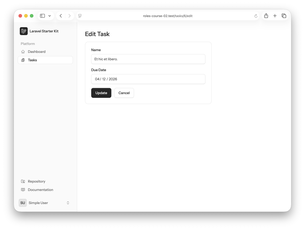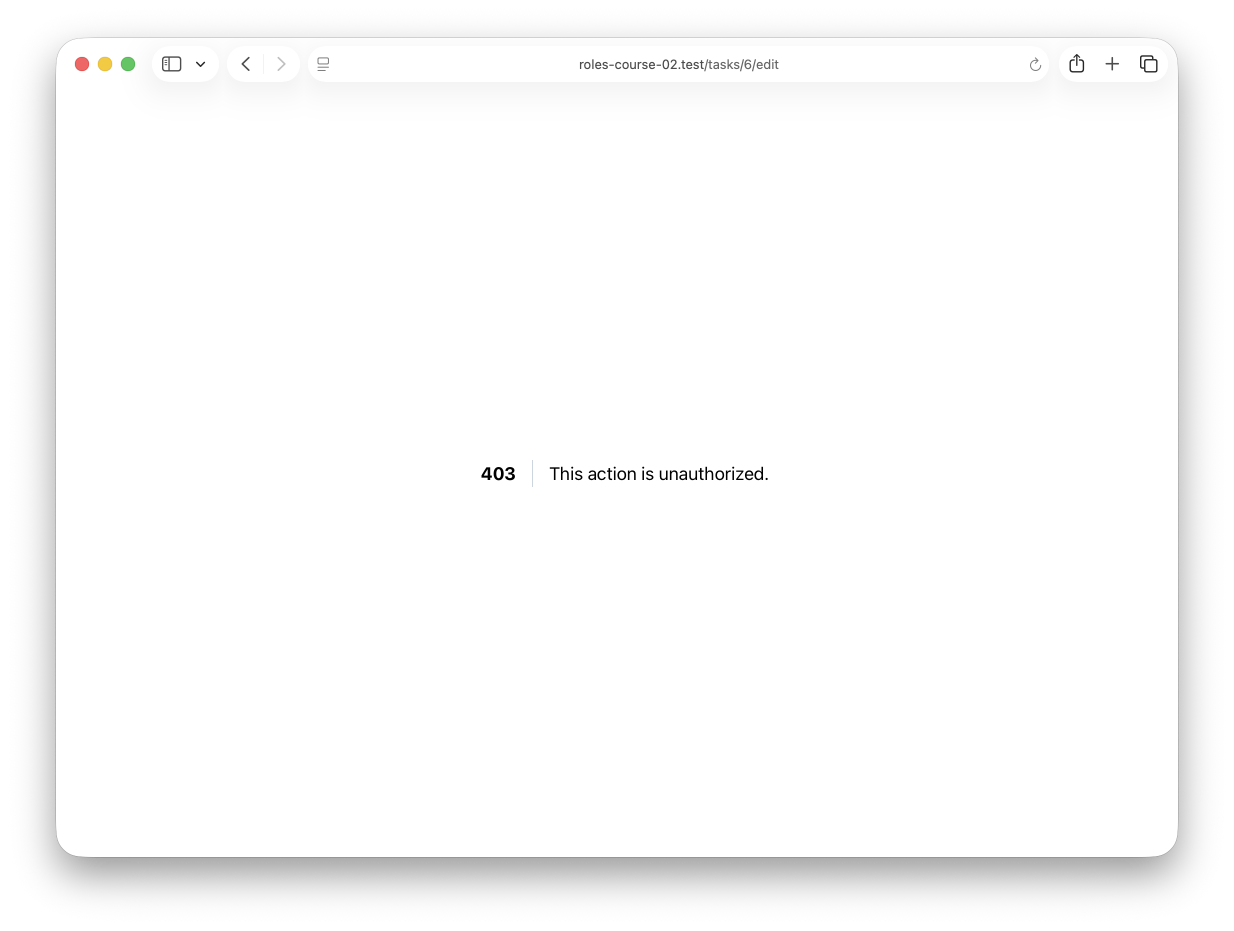 use Illuminate\Support\Facades\Gate; // ... public function index(): View{ $tasks = Task::with('user')->get(); return view('tasks.index', compact('tasks'));} public function create(): View{ Gate::authorize('create-task'); return view('tasks.create');} public function store(Request $request): RedirectResponse{ Gate::authorize('create-task'); Task::create($request->only('name', 'due_date') + ['user_id' => auth()->id()]); return redirect()->route('tasks.index');} public function edit(Task $task): View{ Gate::authorize('update-task', $task); return view('tasks.edit', compact('task'));} public function update(Request $request, Task $task): RedirectResponse{ Gate::authorize('update-task', $task); $task->update($request->only('name', 'due_date')); return redirect()->route('tasks.index');} public function destroy(Task $task): RedirectResponse{ Gate::authorize('delete-task', $task); $task->delete(); return redirect()->route('tasks.index');}