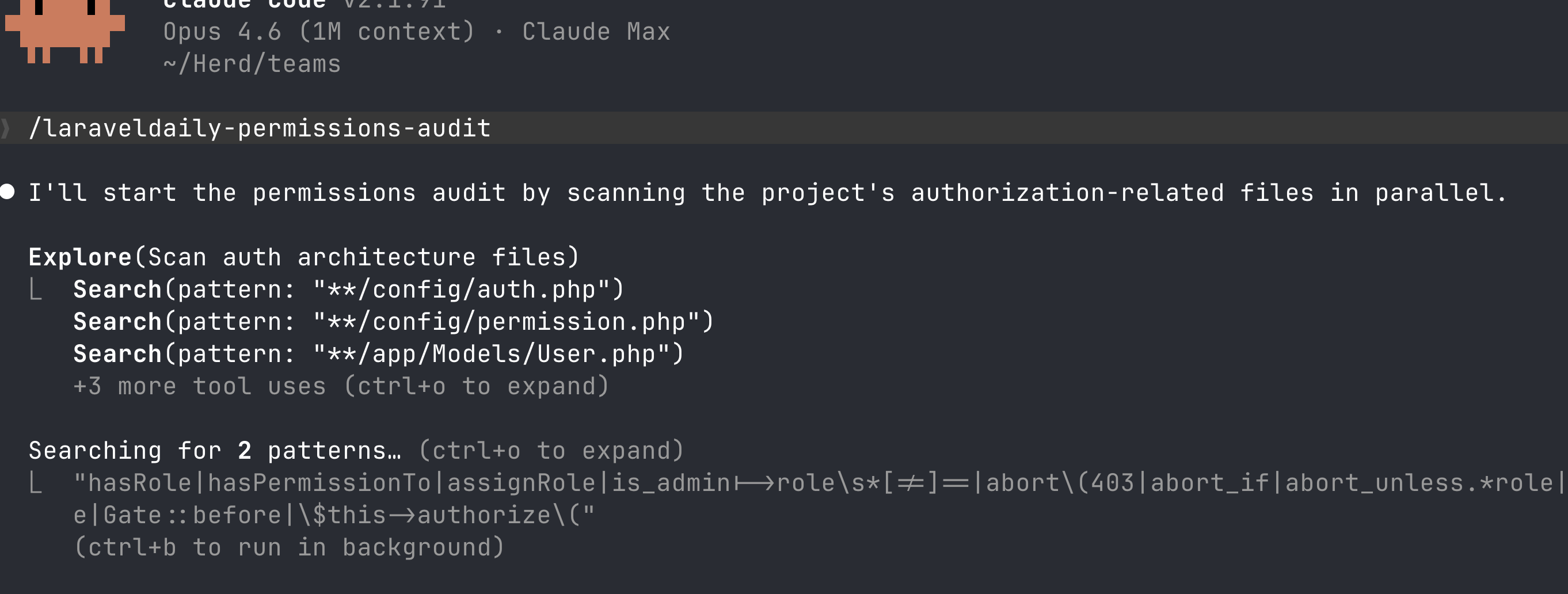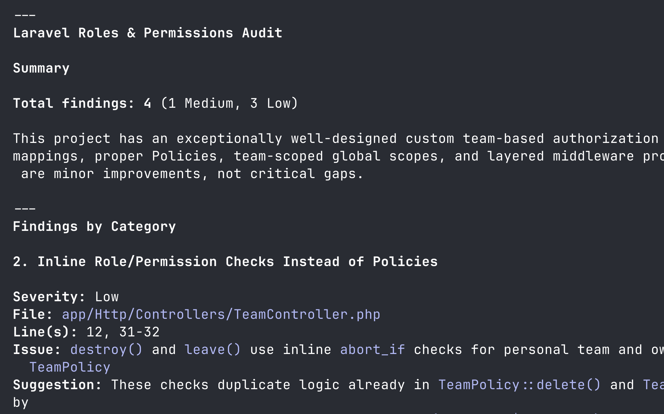 After installation, you just run laraveldaily-permissions-audit on your codebase: