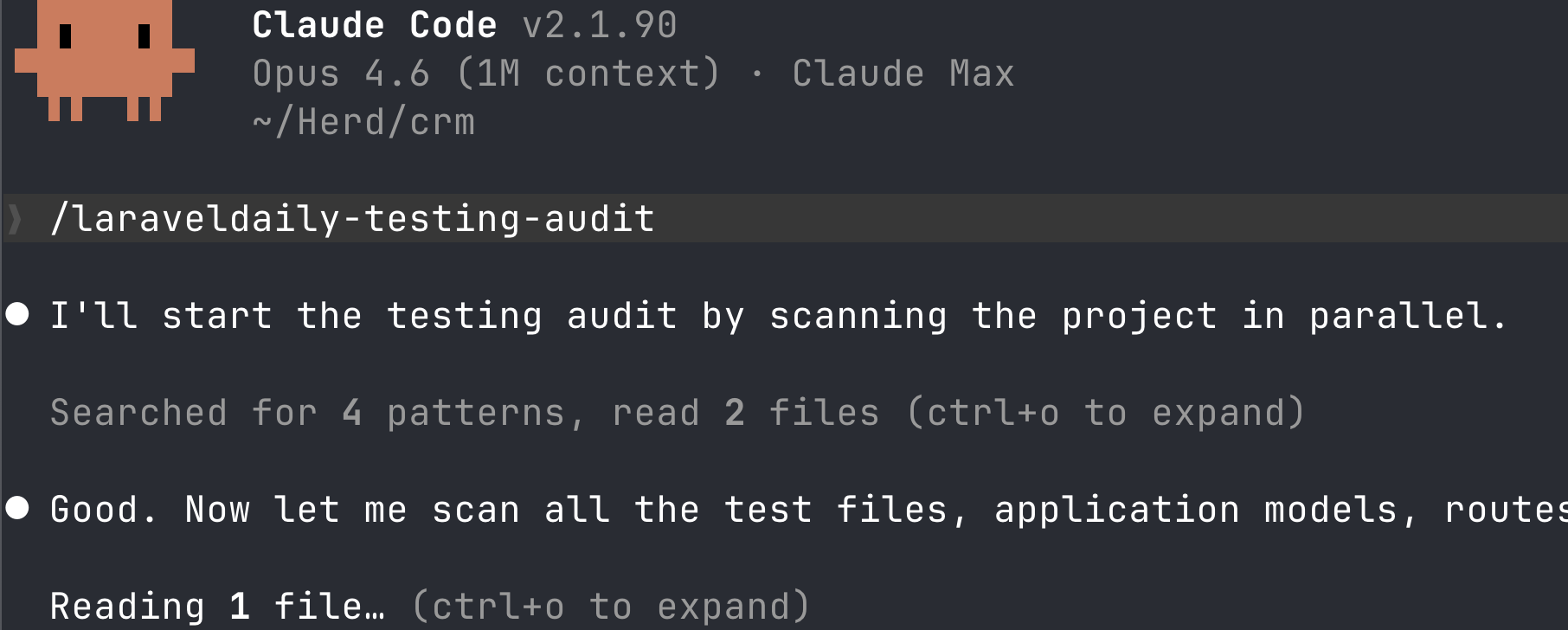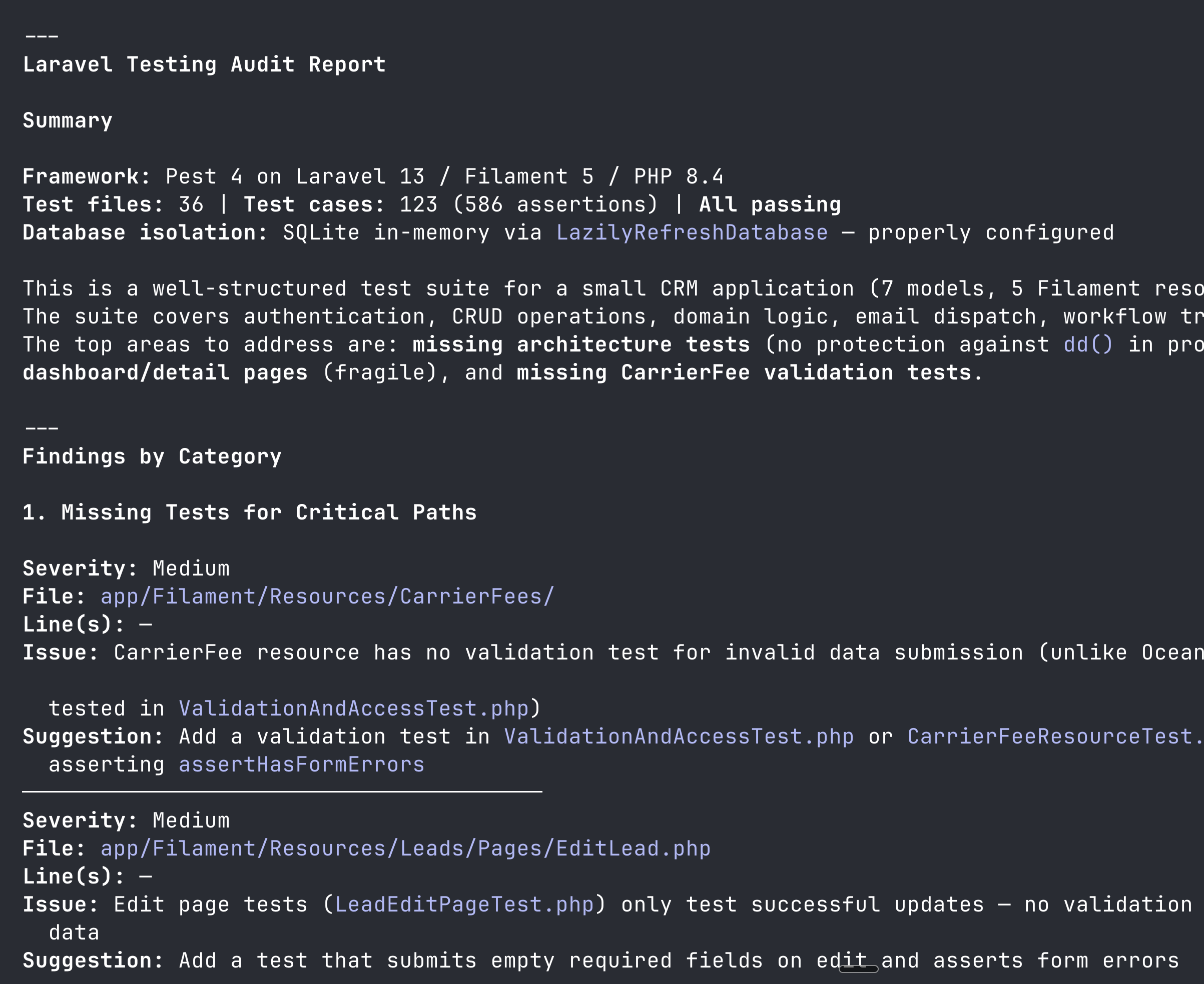 After installation, you just run laraveldaily-testing-audit on your codebase:
