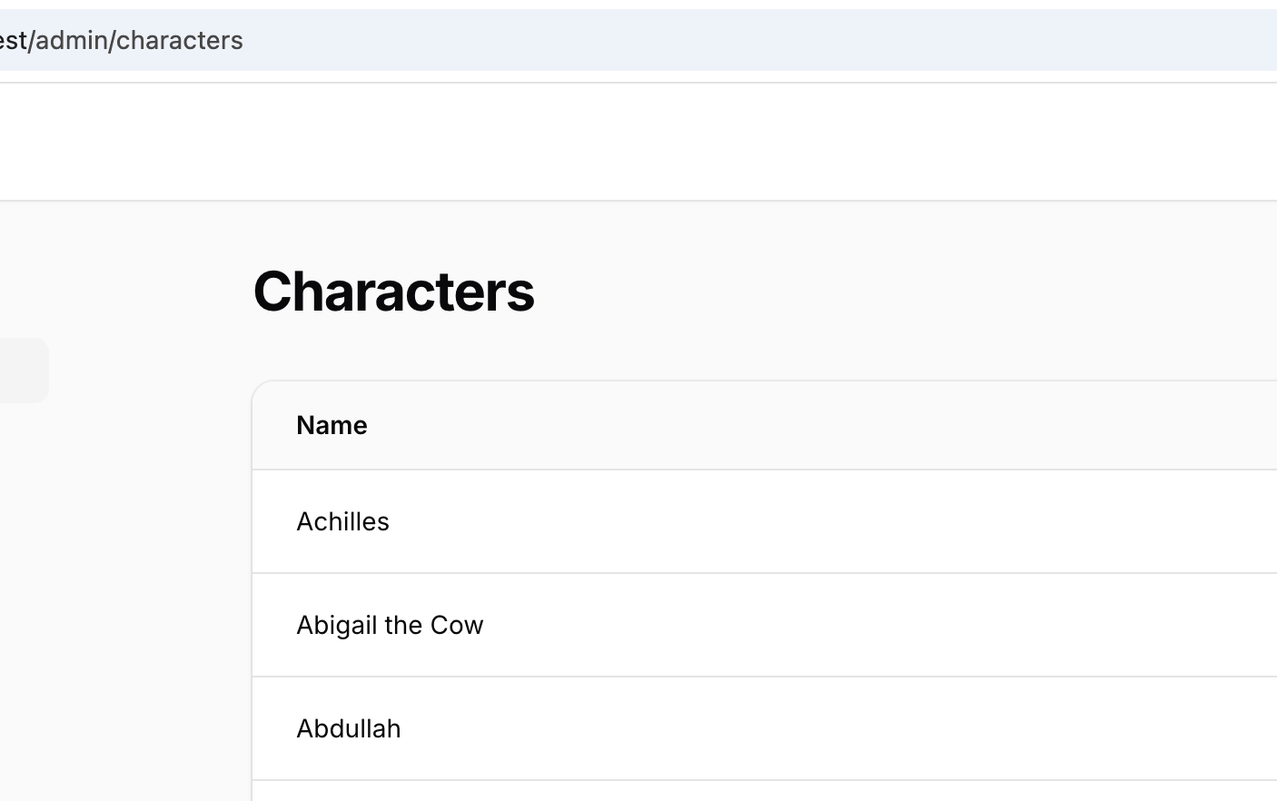 use Filament\Pages\Page;use Filament\Tables\Table;use Filament\Tables\Columns\TextColumn;use Illuminate\Support\Facades\Http;use Filament\Tables\Concerns\InteractsWithTable;use Filament\Tables\Contracts\HasTable; class Characters extends Page implements HasTable{ use InteractsWithTable; protected string $view = 'filament.pages.characters'; protected static string $icon = 'heroicon-o-user-group'; public function table(Table $table): Table { return $table ->records(fn (): array => Http::baseUrl('https://api.disneyapi.dev') ->get('character') ->collect() ->get('data', []) ) ->columns([ TextColumn::make('name'), ]); }}