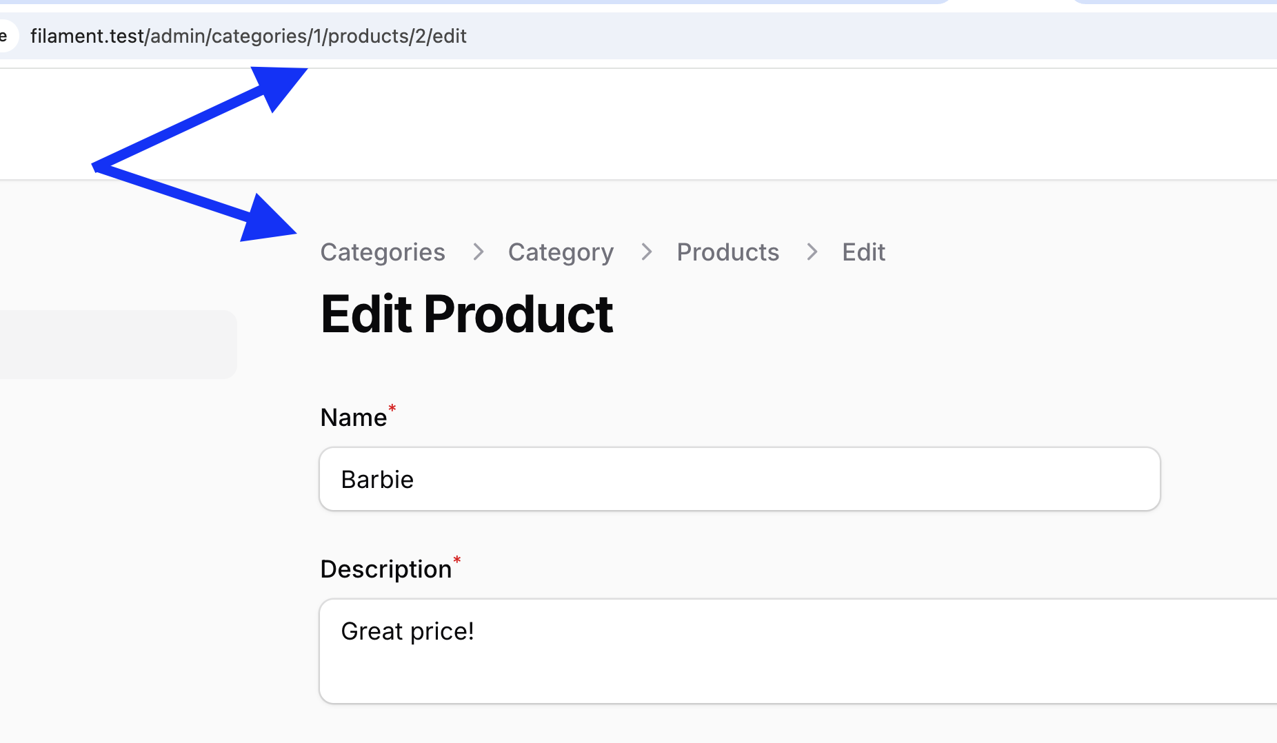 use App\Filament\Resources\Categories\CategoryResource; // ... class ProductResource extends Resource{ protected static ?string $parentResource = CategoryResource::class; // ...
