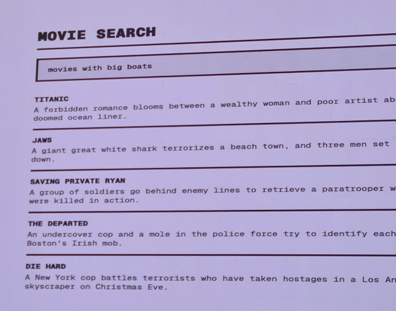 Notice the search query is about "big boats", but the movie "Titanic" description doesn't contain the word "boat". That's search with the help of embeddings.