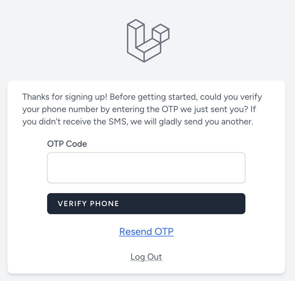 use App\Notifications\SendOtpNotification; class RegisteredUserController extends Controller{ // ... public function store(Request $request): RedirectResponse { $request->validate([ 'name' => ['required', 'string', 'max:255'], 'phone' => ['required', 'string', 'max:20', 'unique:' . User::class, new PhoneNumber], 'password' => ['required', 'confirmed', Password::defaults()], ]); $user = User::create([ 'name' => $request->name, 'phone' => $request->phone, 'password' => Hash::make($request->password), ]); // Generate and send OTP via Vonage $otp = rand(100000, 999999); $user->update([ 'otp_code' => $otp, 'otp_expires_at' => now()->addMinutes(10), ]); $user->notify(new SendOtpNotification($otp)); Auth::login($user); return redirect(URL::signedRoute('verification.notice')); }}