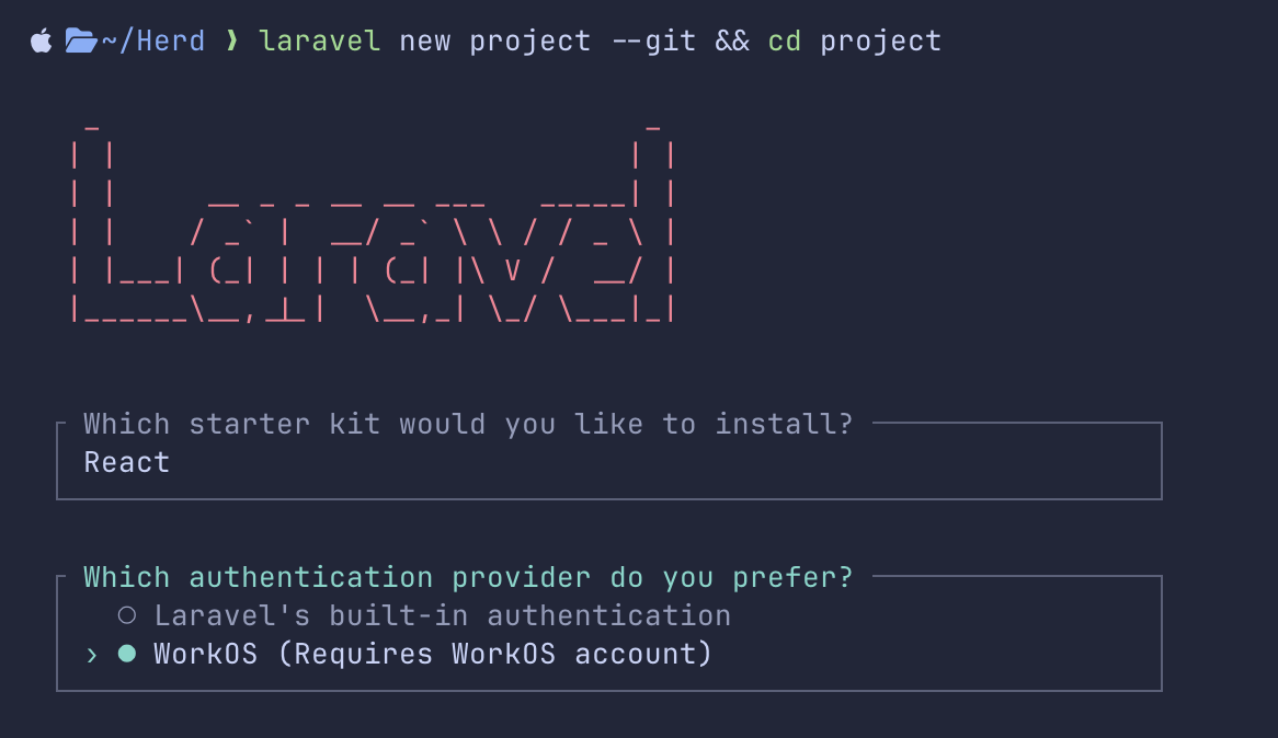 When creating a new Laravel application, you may choose WorkOS as an authentication provider, instead of the default Laravel Auth.