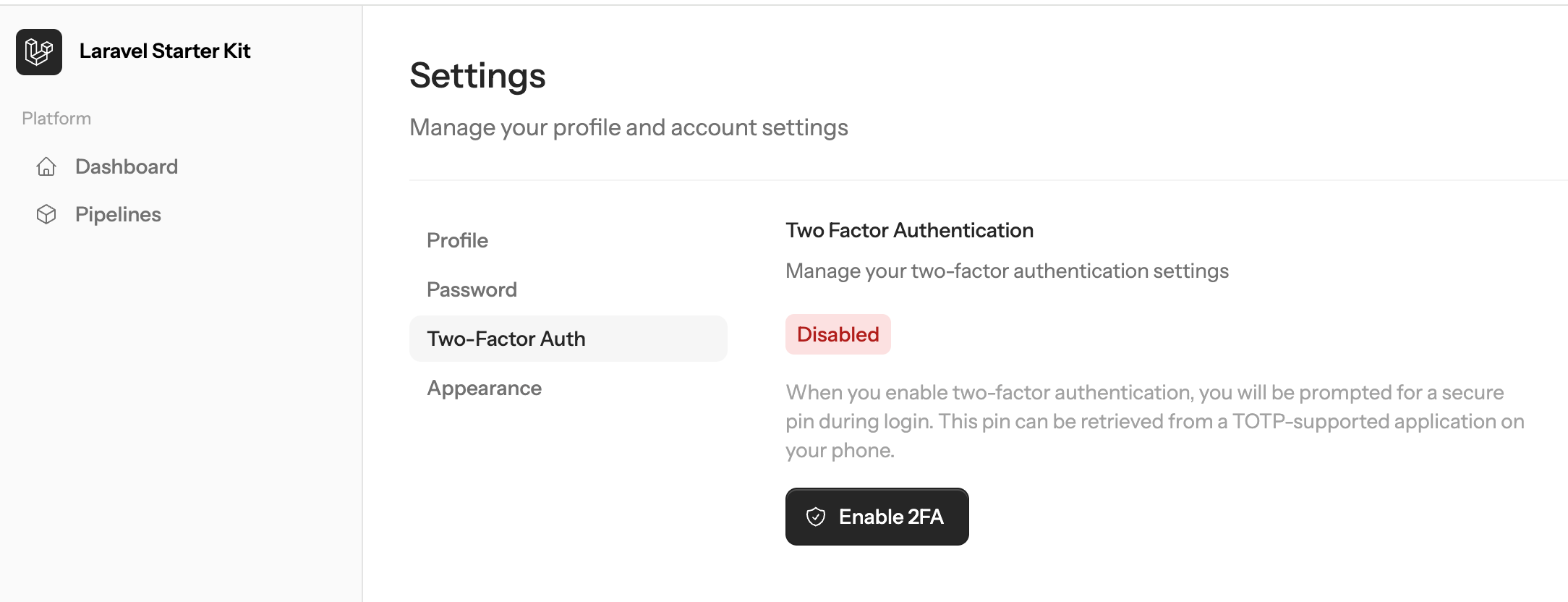 Option 1. Official Starter Kits. Laravel 12 official React/Vue/Livewire starter kits were first released without two-factor auth, but in October 2025, they were upgraded to have 2FA, powered by Laravel Fortify.