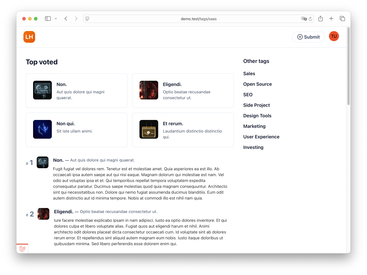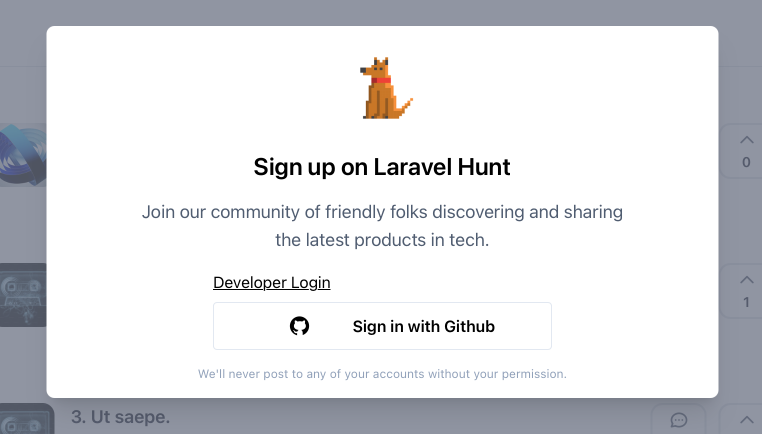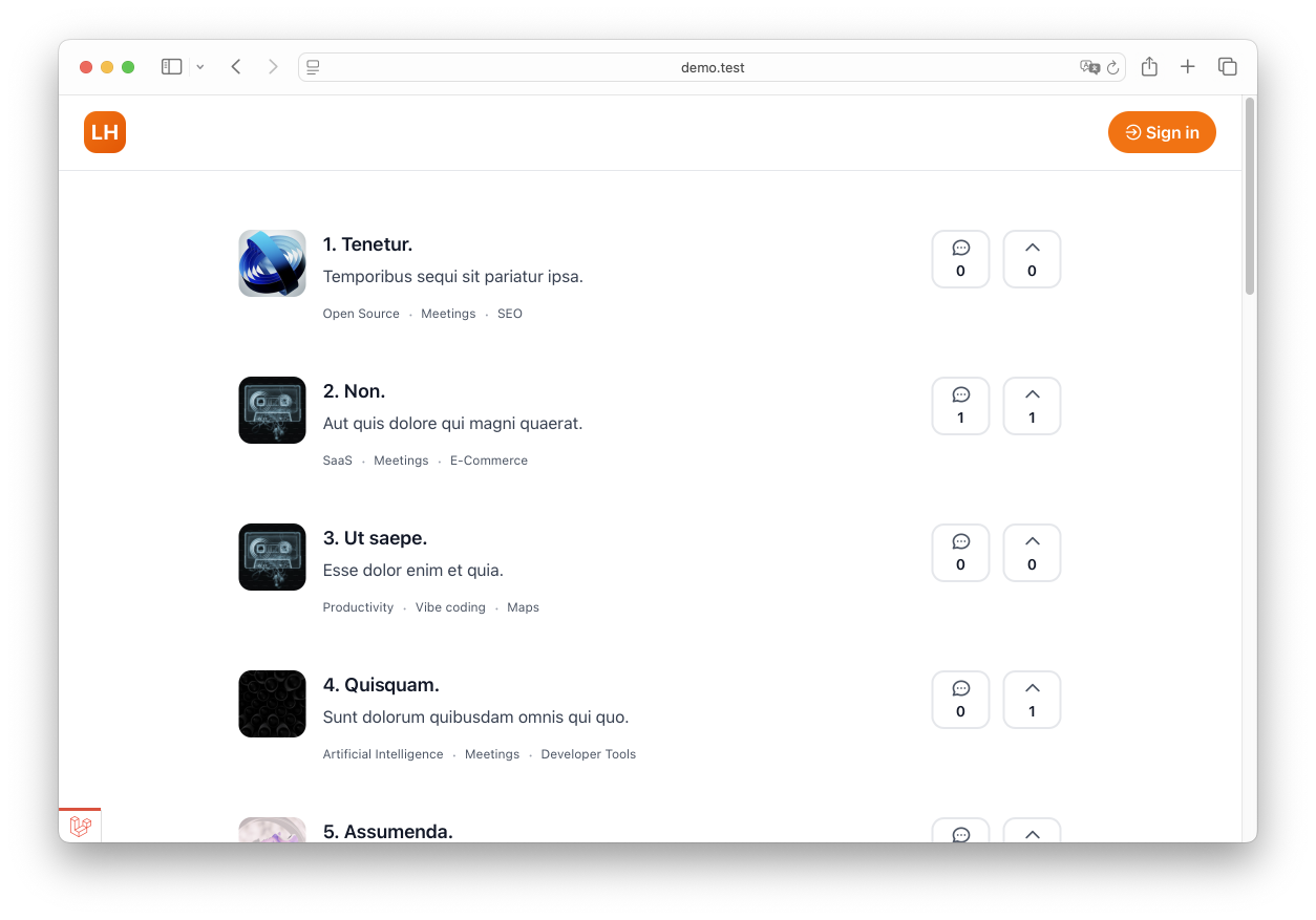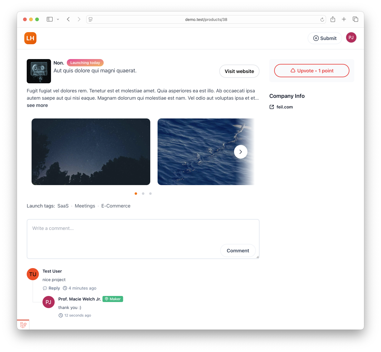 This project recreates the core functionality of Product Hunt as a lightweight web application. Users can browse and submit products, organize them with tags, and engage through upvotes and comments. Built with Laravel on the backend and Livewire/Alpine for interactive frontend components, the application features a polished user experience with modal dialogs, image galleries, and seamless upvoting. Authentication is handled through GitHub login integration using Socialite, allowing users to quickly sign in with their existing GitHub accounts.