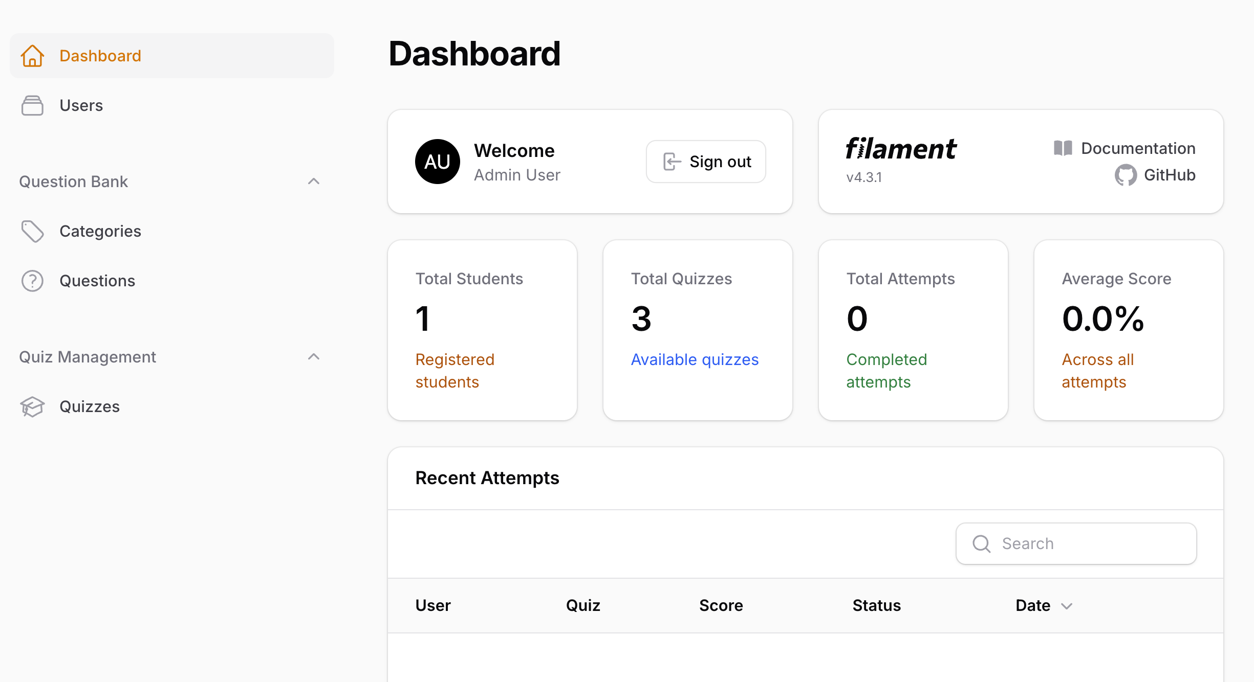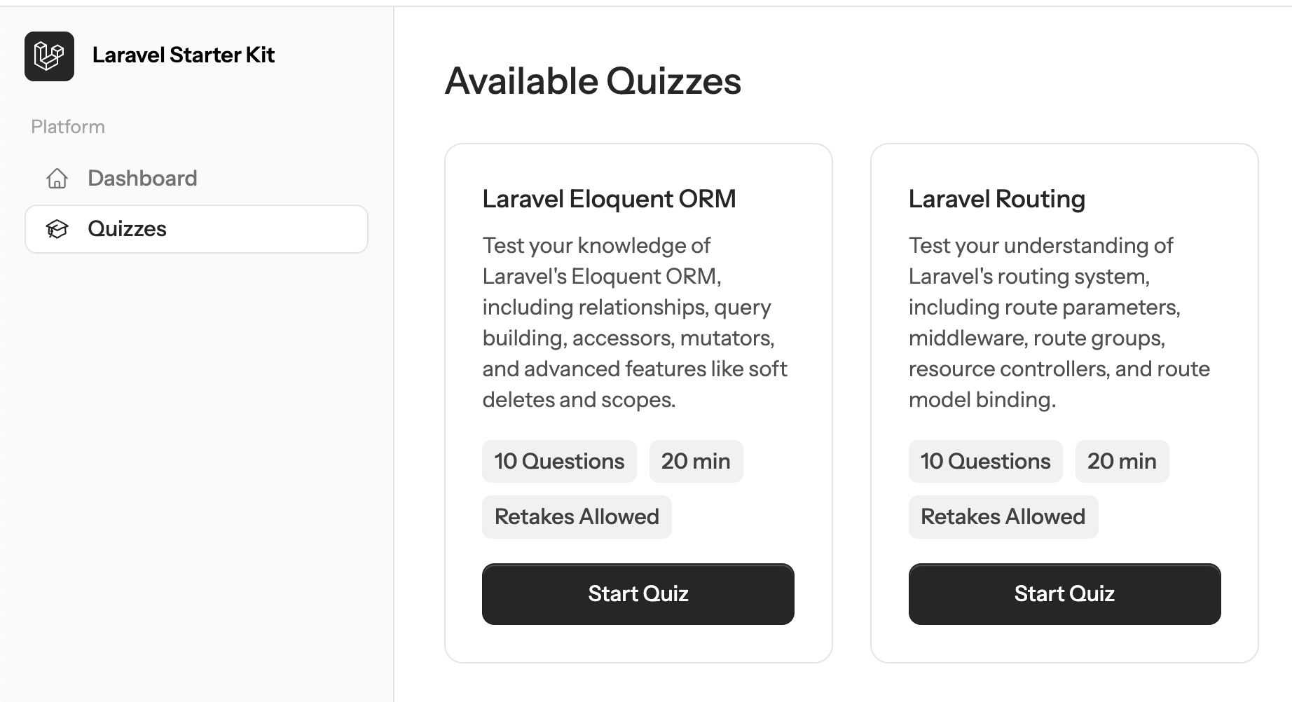 Fortify powers authentication, so after registration the user immediately lands on /dashboard. From there they can browse quizzes, take them, and open attempt results. Those screens live behind the auth middleware: